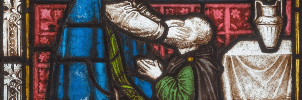 Ananias restoring sight to Saul, stained glass in St Mary Abbot`s Church, London, UK