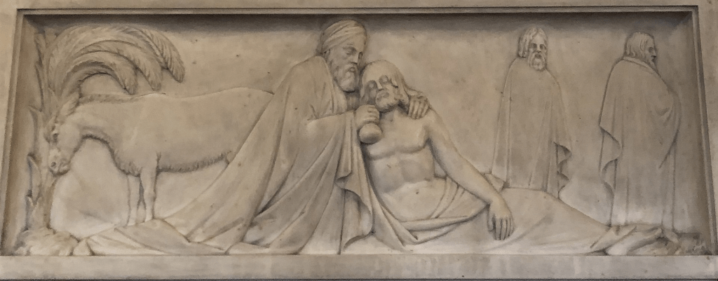 “But a Samaritan while traveling came upon him, and when he saw him he was moved with compassion. He went to him and bandaged his wounds, treating them with oil and wine. Then he put him on his own animal, brought him to an inn, and took care of him. The next day he took out two denarii, gave them to the innkeeper, and said, ‘Take care of him, and when I come back I will repay you whatever more you spend.’