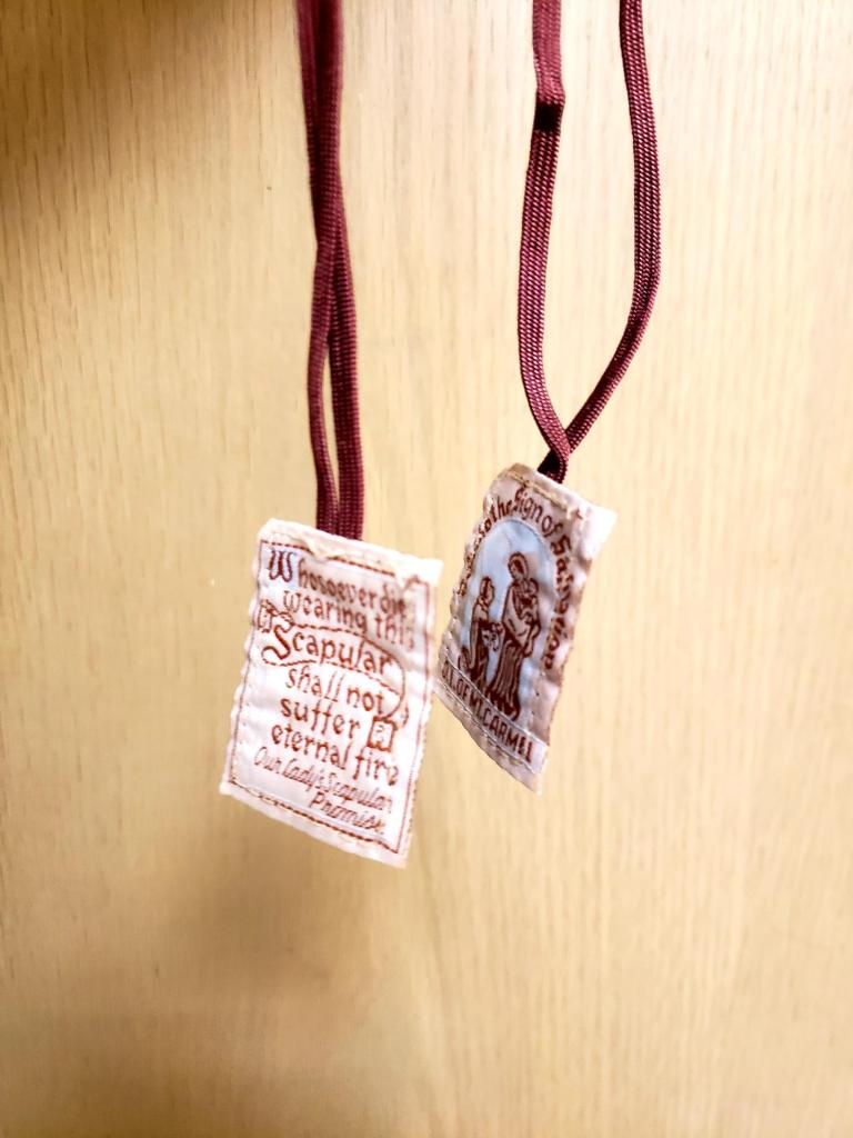 On my hospital office desk, where I can see it every day, is a scapular. “Scapular” is the Latin word for “shoulders.” A scapular typically consists of two small pieces of cloth, a few inches in size, which has a religious image on one, and a message on the other. There are two bands of cloth connecting the message or image.